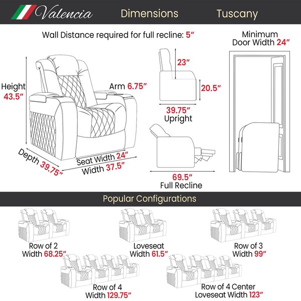The seats have a high-quality wood and steel frame construction that is wrapped in premium Italian top grain 11000-grade leather. This row of 2 seats is designed by the best Italian furniture craftsman that uses the best Italian leather to create this row of 2 Tuscany that is luxurious and comfortable. It is sleek yet space-saving at the same time; it is also ergonomically designed with proper support. The wall-hugging design was also created to optimize the space of any room. The led cupholders and base ambient lighting add to the real movie theater look while the smooth motorized recline mechanism, power headrest, and lumbar support also ensure the perfect seating position. It also features hidden armrest storage, a USB charger, and a whisper-quiet motorized recline.